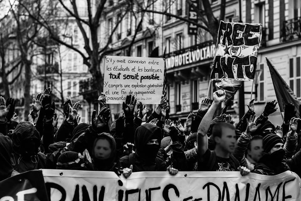 C’est tout au fond de la manifestation que ressurgit l’ambiance des cortèges de tête. Un carré ingouvernable, antifasciste et autonome, fort de plus de mille personnes, constellé de banderoles stylées, ferme la marche. Ambiance tonique malgré le rythme lent, parfois stagnant, d’un fond de manifestation. Quelques banques sont étoilées pour la forme, alors que le défilé progresse, calme et déterminée. L’ambiance s’échauffe en fin de parcours. La police est tenue en respect, après quelques grenades lacrymogènes. Mais ici encore, dans une sérénité partagée.
