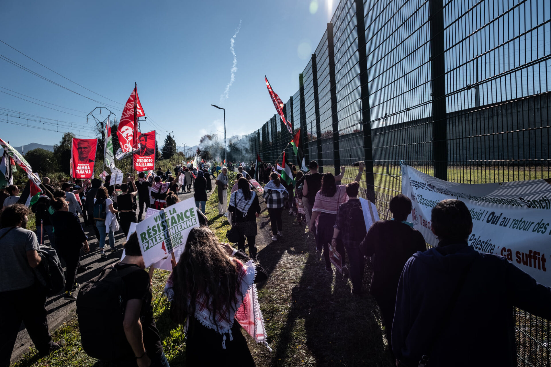 Le cortège est également très honorable en nombre de visuels : drapeaux, banderoles, fumigènes… traduisant l’ambiance et la détermination des participant.e.s. Plusieurs personnes montent sur les grilles entourant la prison, d’autre font sérieusement vaciller la porte d’enceinte, dans un boucan respectable. Les prises de paroles se succèdent, de Pierre Stambul de l’Union Juive Française pour la Paix à Philippe Poutou. Mais le discours le plus important, le plus vibrant, sera celui de George Abdallah lui-même, via une lettre lue par une militante. Ses paroles résonnant au micro devant le centre pénitentiaire pyrénéen. Des paroles lues comme une ode à la révolte, pour maintenir et poursuivre nos luttes.