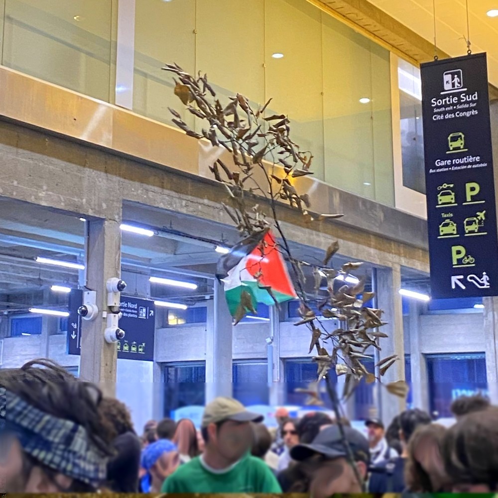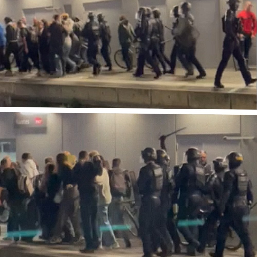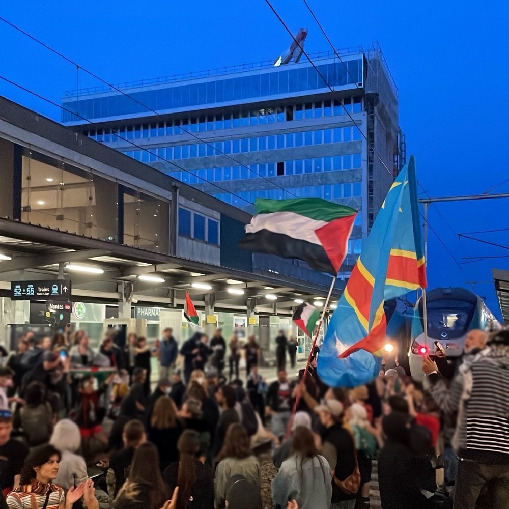 La gare se remplit et les quais débordent. Les rails sont occupés. On entend chanter «Gaza, Nantes est avec toi !» C’est un moment de force collective avant une arrivée fracassante des CRS qui ont rattrapé leur retard. Ils se mettent à courir pour effrayer les manifestant-es qui se retrouvent dans les escalators des quais, en les huant. Les CRS chassent les militants jusqu’à la sortie de la gare. La foule se disperse et les forces de l’ordre entourent la gare et filtrent les sorties. Réussir à bloquer ce lieu stratégique, même quelques instants, est déjà un exploit tant il est inaccessible et militarisé à chaque manifestation.