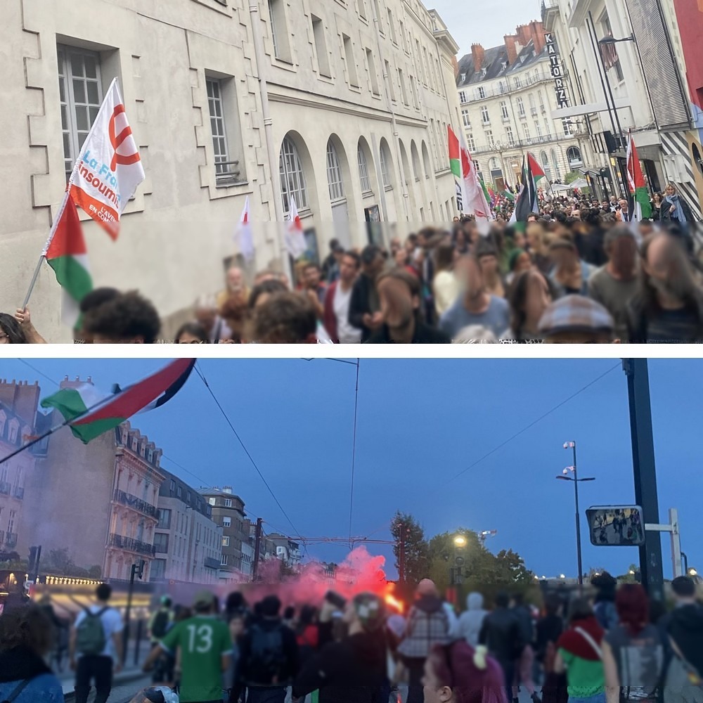 À Nantes comme partout dans le monde, des mobilisations ont eu lieu pour soutenir la flottille et ses membres. Un appel en début de soirée sur l’habituel Miroir d’eau, suivi de prises de parole et d’un cortège qui avait tout d’une manifestation classique a fait un grand tour dans la ville. Drapeaux hissés et slogans hurlés pour un cortège d’environ 2000 personnes. Alors que pour la manifestation syndicale du matin, un dispositif policier colossal avait été déployé, il n’y avait que peu de forces de l’ordre ce soir, et le défilé a lieu dans le calme.