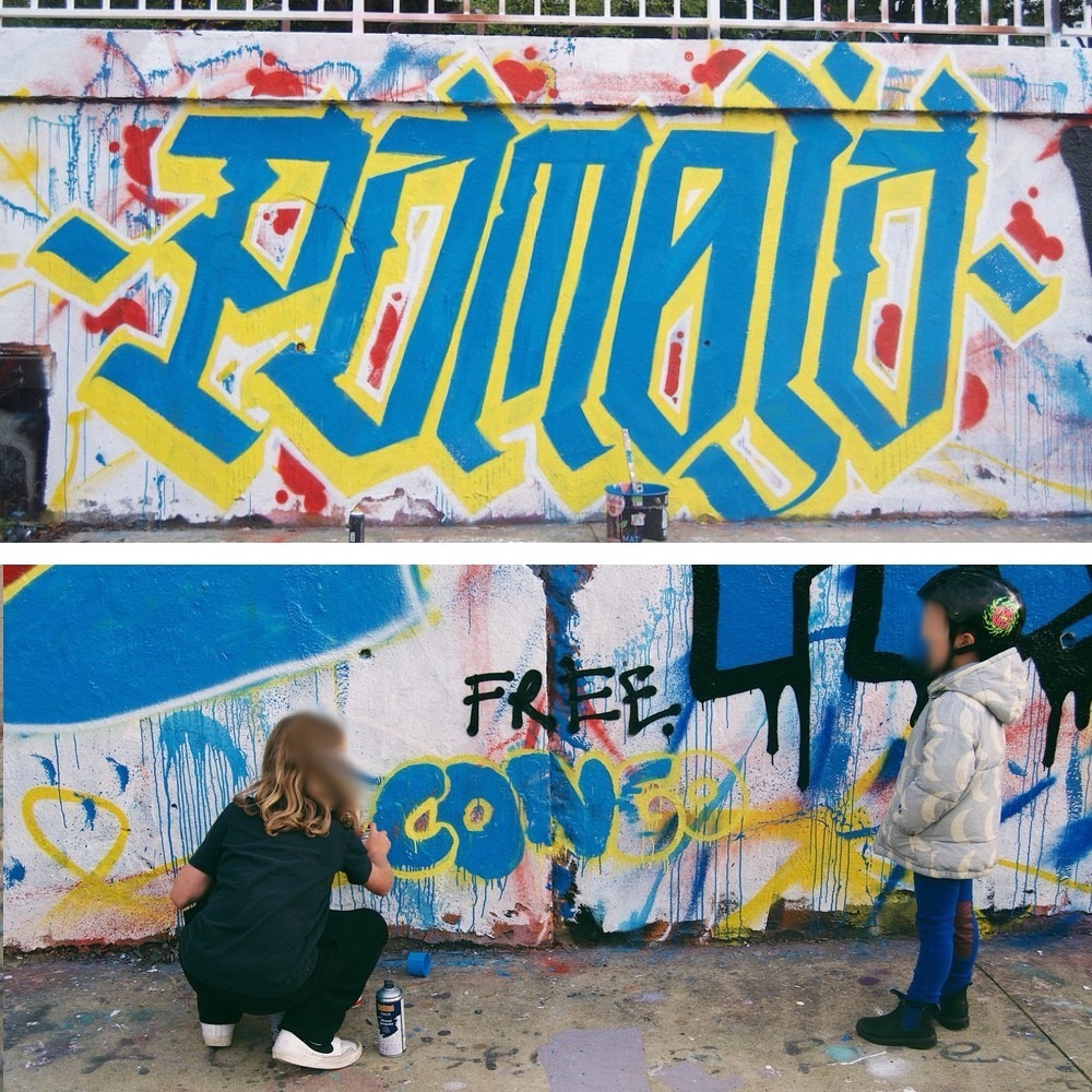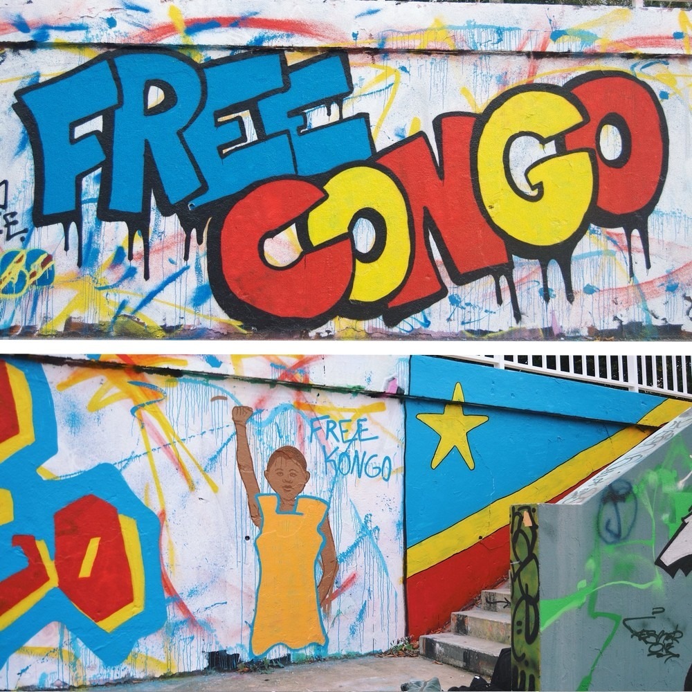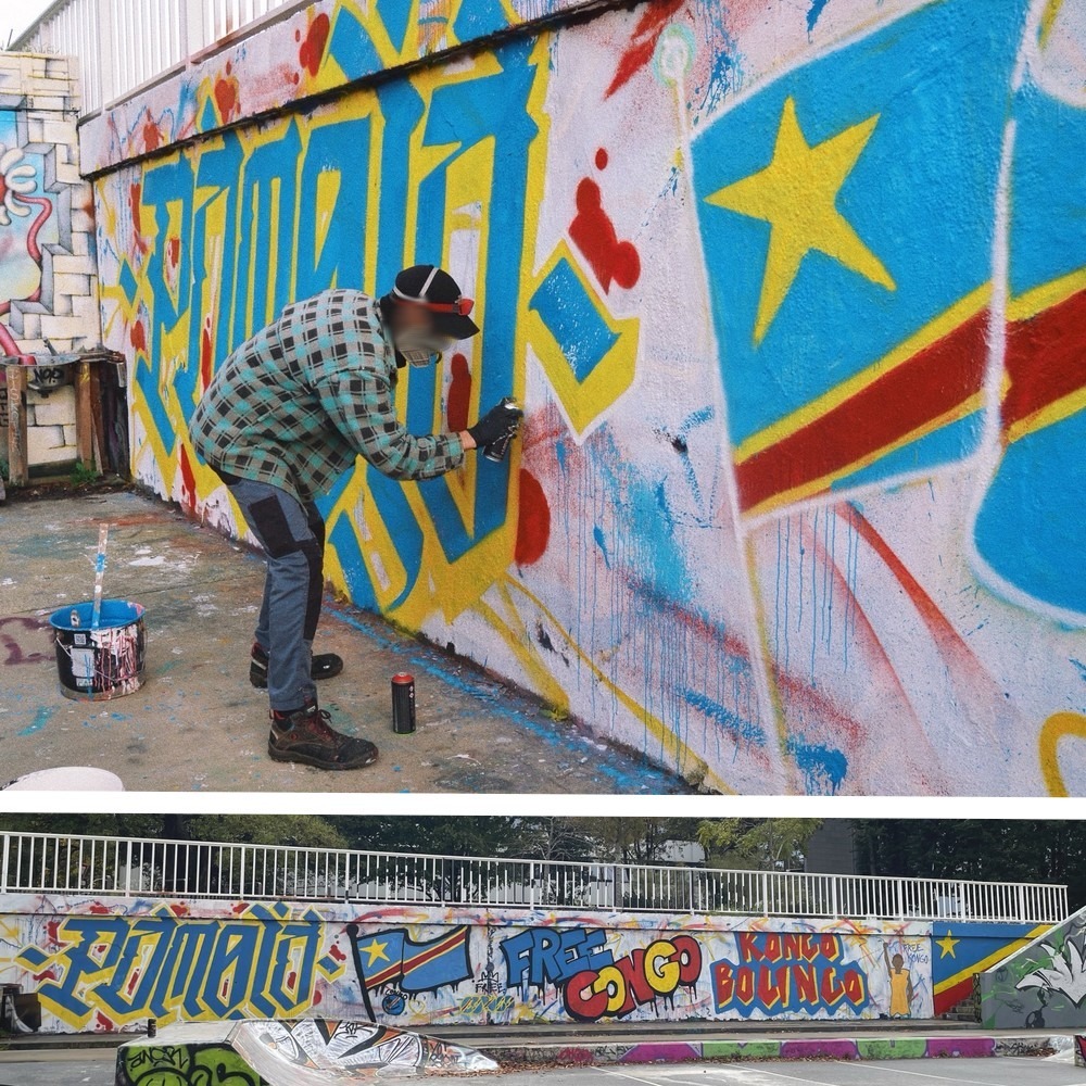 Au cours de l’après-midi ce sont pas moins de 20 mètres de mur qui furent entièrement recouverts de messages et illustrations aux couleurs du drapeau congolais. Les passant·es et skater·euses amusé·es pouvaient lire pêle-mêle : «Pamoja», signifiant «ensemble» en kiswahili, une des langues parlées à l’Est du pays où se déroulent les massacres commis par des groupes armés (notamment le M23), «Kongo Bolingo» en référence à l’écriture du Congo avant la colonisation, Bolingo se traduisant par amour en lingala, ainsi qu’un «Free Congo» appelant à l’action des peuples pour dénoncer la complicité des gouvernements et des multinationales de la tech, qui exploite les minerais présents dans le sol du pays. On retrouvera également plusieurs drapeaux de la République Démocratique du Congo ainsi que le portrait d’une jeune fille congolaise, inspiré d’une photographie.