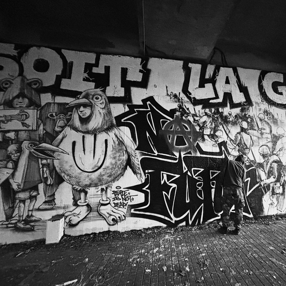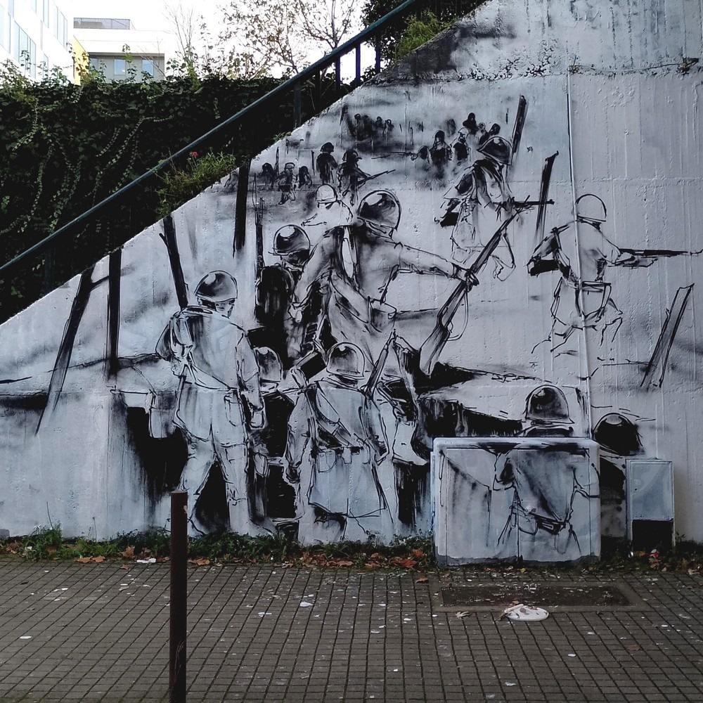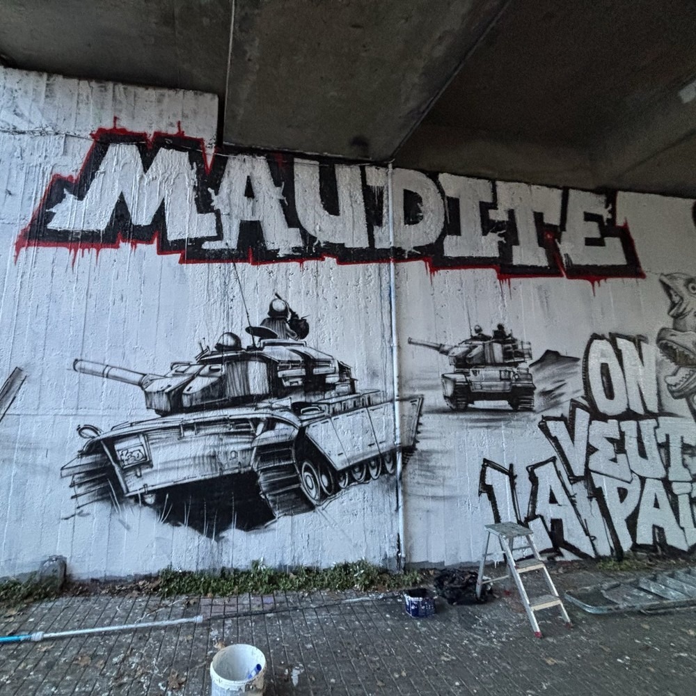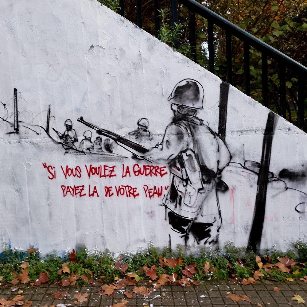 Ce mardi 11 novembre, le collectif Black Lines vient encore de frapper un grand coup à Nantes. À l’occasion du 11 novembre, date commémorant la fin de la Première Guerre mondiale, atroce boucherie mécanique qui a emporté des millions de vies et qui a enfanté le totalitarisme, les peintres ont réalisé une immense fresque proclamant «Maudite soit la guerre».