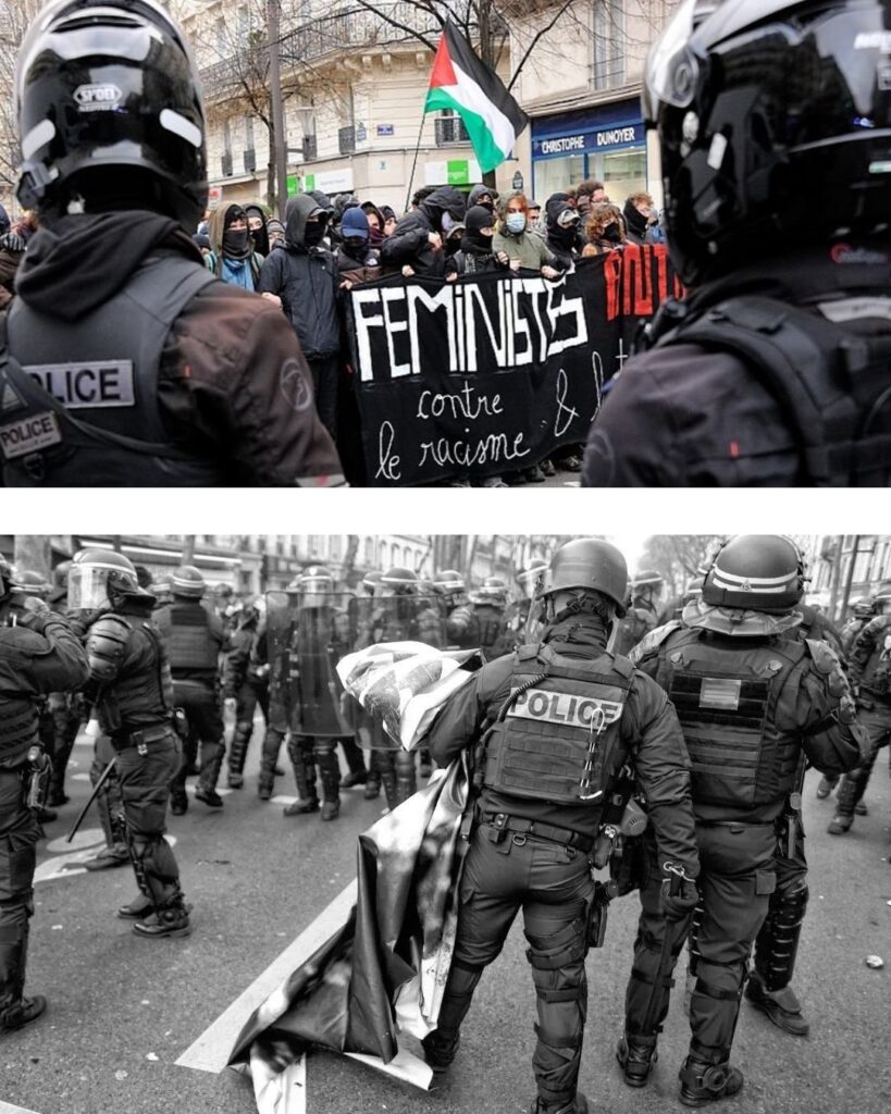 Lors de cette manifestation, la police a chargé et gazé le cortège féministe antifasciste, et en a profité pour voler, avec une grande violence, sa banderole. C’est ainsi qu’une unité de policiers cagoulés s’est retrouvée à se photographier dans le commissariat, renversant la banderole sous un drapeau français, fiers de leur acte.