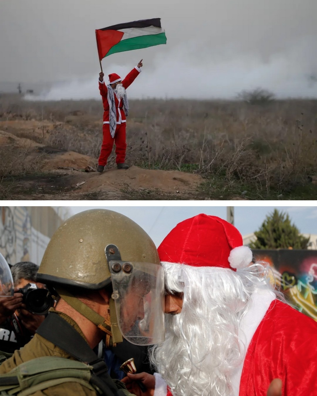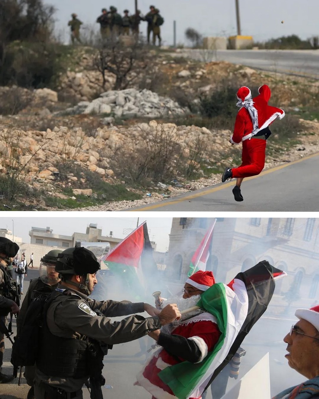 En 2017, près de Ramallah en Cisjordanie (Palestine occupée), des palestiniens en tenues de Père Noël brûlent la photo de Donald Trump après que les États-Unis aient reconnu Jérusalem comme capitale d’Israël, et affrontent les forces d’occupation.