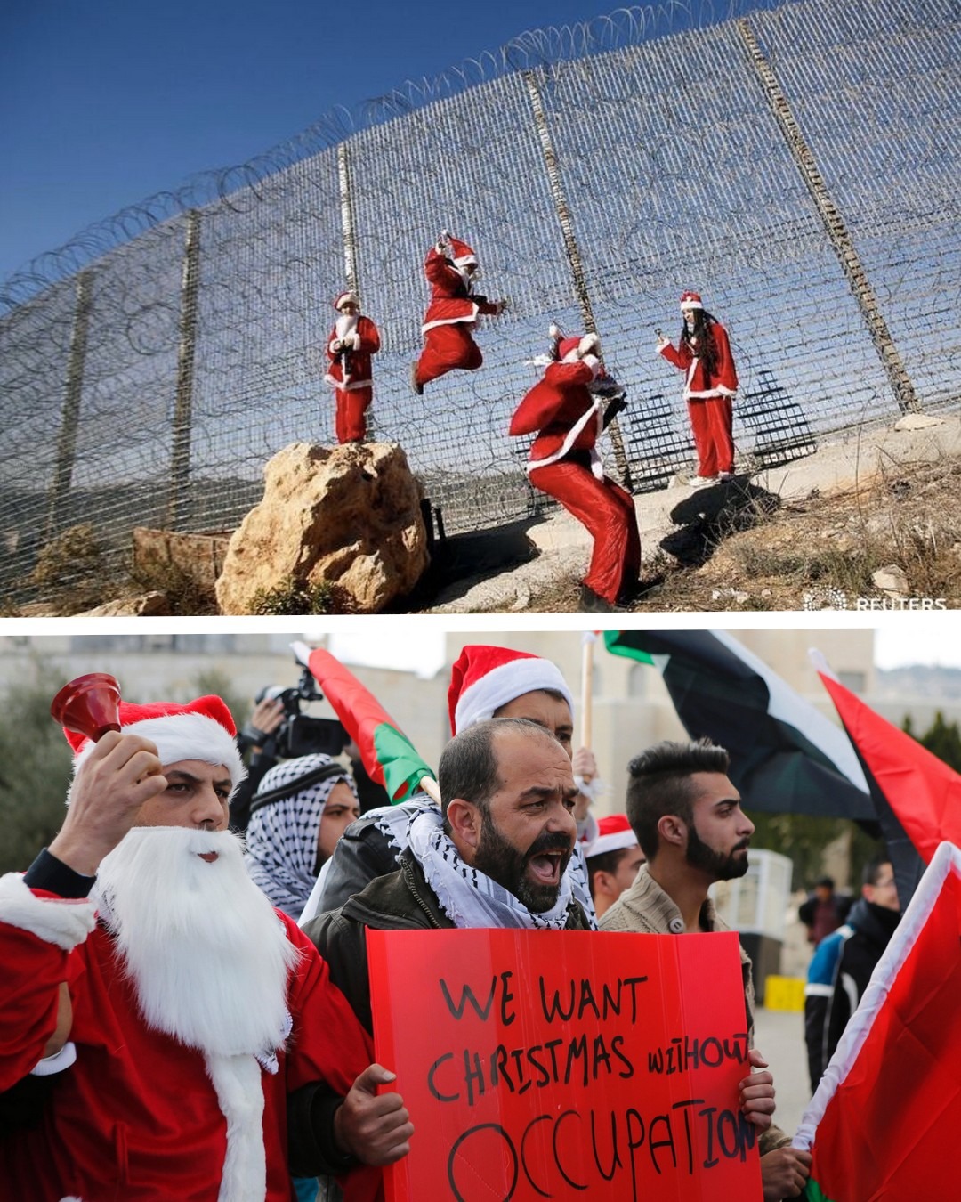 En 2018, des chrétiens palestiniens déguisés en Père Noël se voient interdire par Israël d’entrer à Jérusalem alors qu’ils souhaitent fêter la naissance de Jésus. Dans l’État d’apartheid, les palestiniens, qu’ils soient musulmans ou chrétiens, ne peuvent pas entrer à Jérusalem sans autorisation spéciale des autorités israéliennes. Certains portent des banderoles : «Nous voulons une Palestine libre pour Noël» et «Nous voulons une Palestine sans colonies».