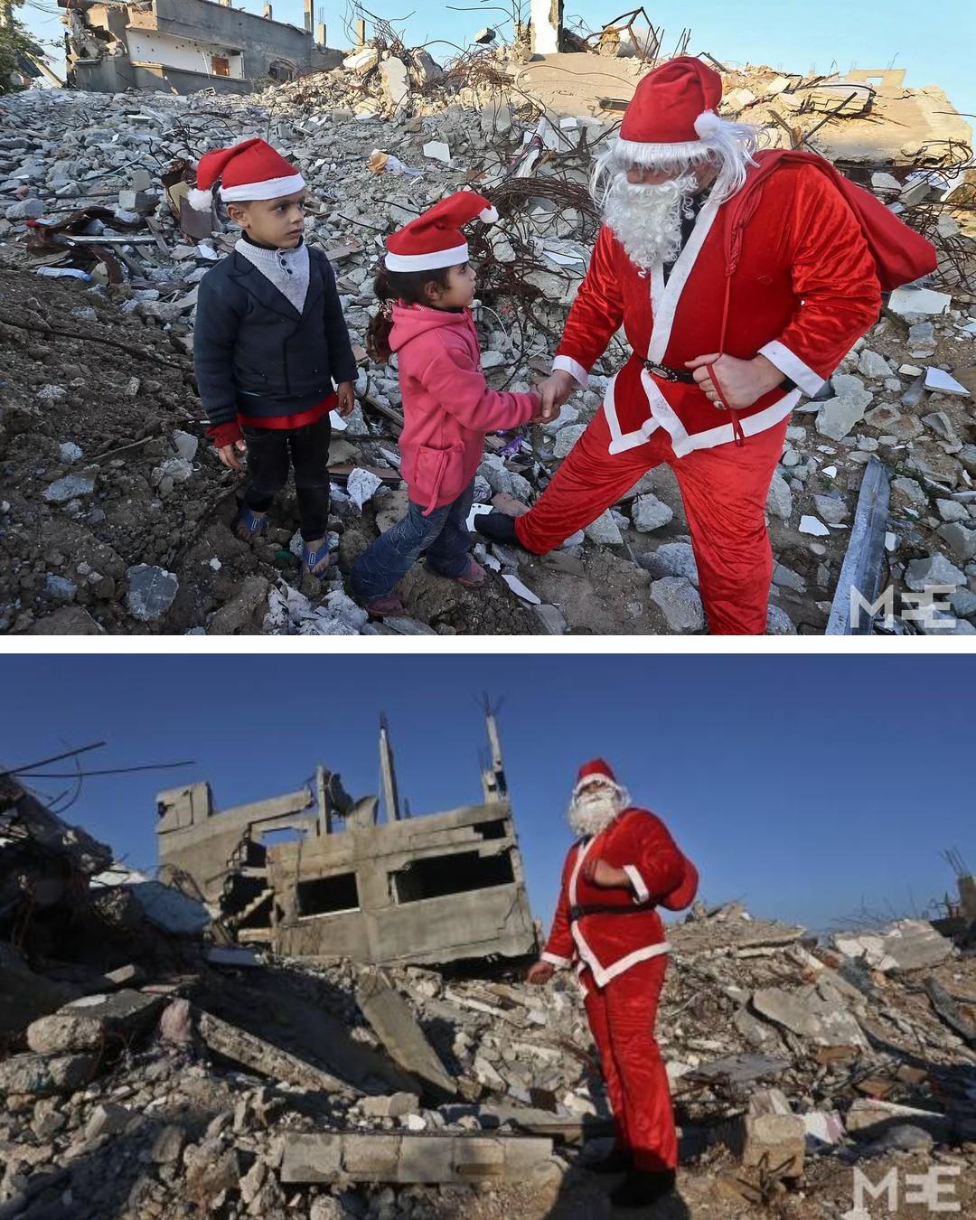 En 2015, le Père Noël apparaît à Gaza avec un gros sac rouge, au milieu des ruines causées par des bombardements terribles survenus quelques mois plus tôt. «Noël est de retour, de toute façon» déclare triomphalement le Père Noël sur les restes de maisons démolies, et sonne avec une clochette pour saluer les enfants.
