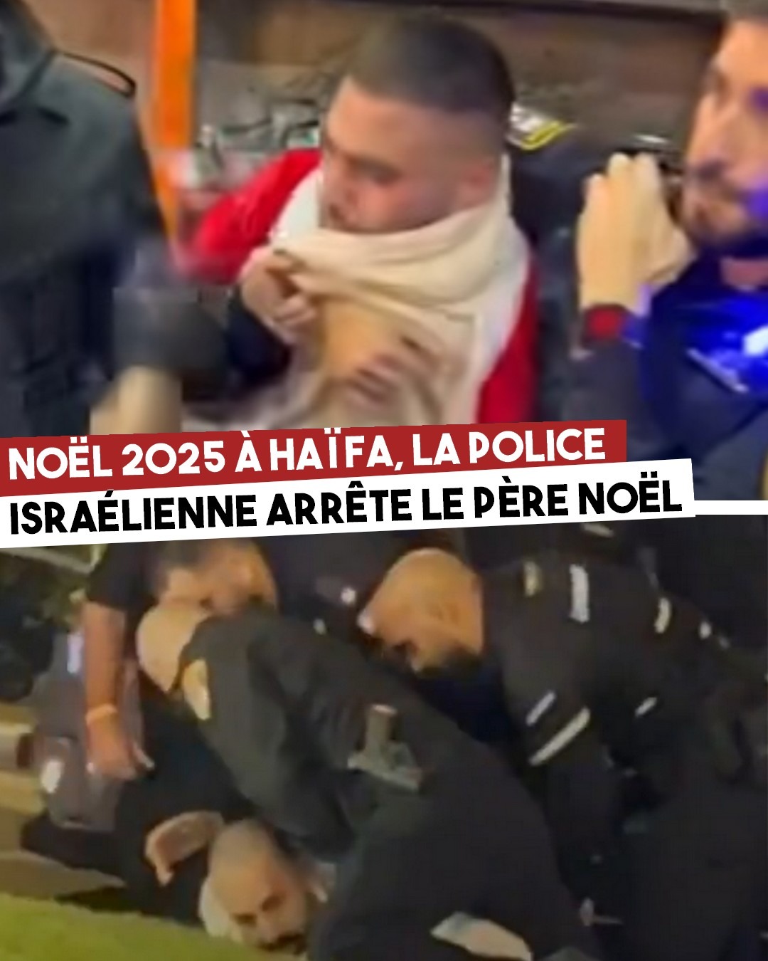 En 2025, la communauté chrétienne palestinienne s’apprête à fêter Noël pour la première fois depuis deux ans. Mais le 21 décembre, à Haïfa, la police israélienne a interpellé un Palestinien déguisé en père Noël, prétextant un «trouble à l’ordre public». Cette répression a interrompu une célébration de Noël, selon une organisation locale de défense des droits. Des vidéos montrent cet homme vêtu en père Noël traîné par des policiers, et l’arrêt d’une danse traditionnelle de dabké. Plusieurs personnes ont été frappées.