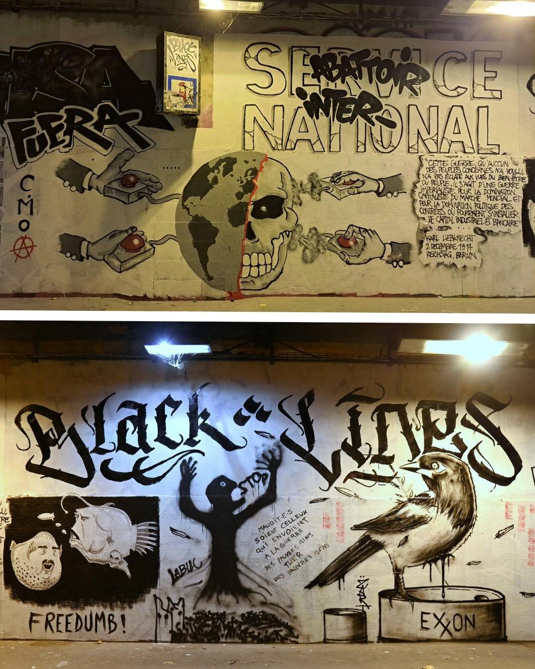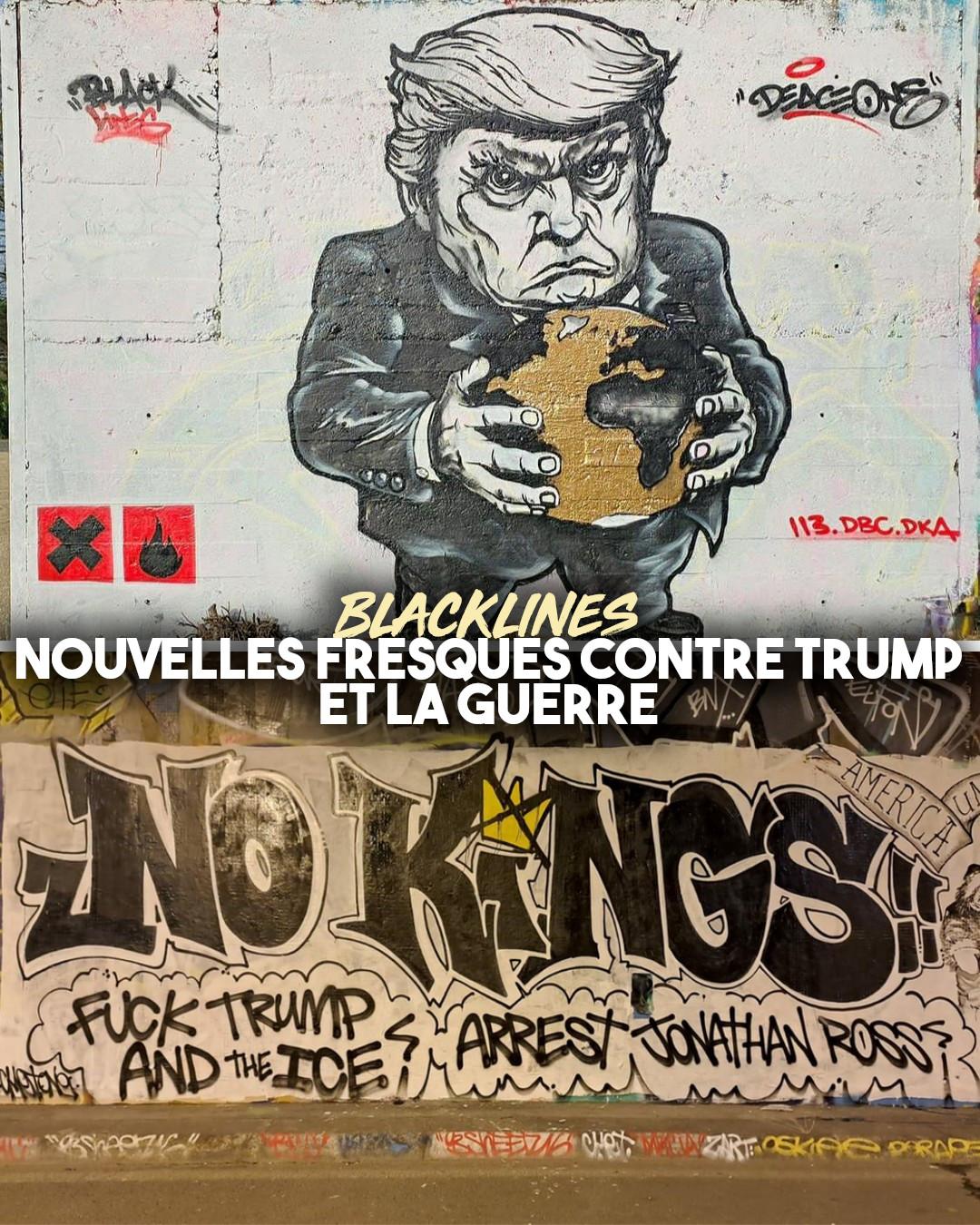 Le collectif Black Lines a réalisé plusieurs nouvelles fresques en noir et blanc en région parisienne ces derniers jours, contre le forcené de la Maison Blanche et sa fuite en avant militariste.