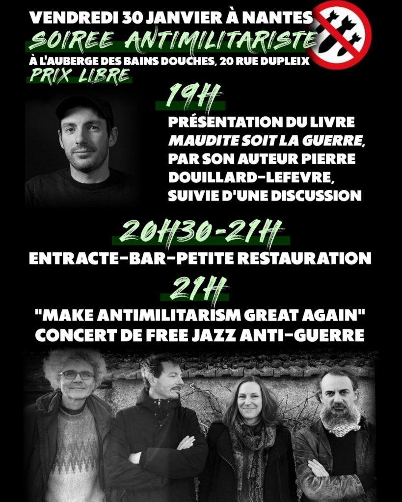 Notez la date : vendredi 30 janvier, une grande soirée contre la guerre et le militarisme a lieu à Nantes. Ce sera à l’Auberge des Bains Douches, 20 rue Dupleix, à partir de 18h30. Nous vous invitons à un moment de discussion et de musique pour penser, échanger, résister à la course vers la guerre organisée par nos dirigeants.