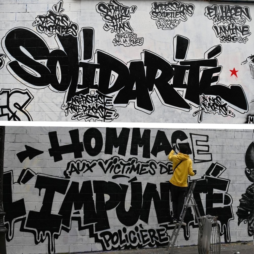Le collectif d’artistes Black Lines a encore frappé ! Une fresque en noir et blanc contre les violences d’État et en hommage aux victimes de la police vient d’être réalisée à Paris.