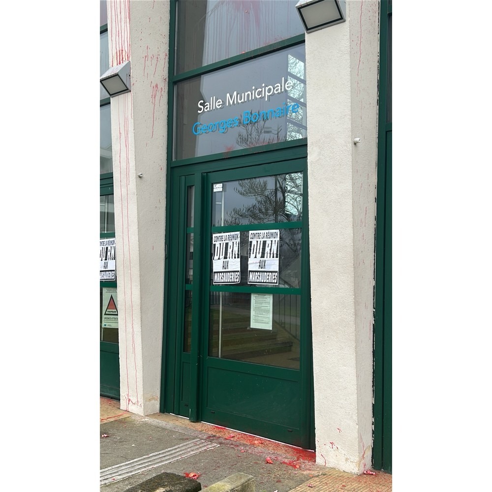 C’est avec le cœur lourd qu’hier soir, je suis venu vandaliser notre salle Bonnaire avec quelques affiches et des œufs de peinture pour protester contre la tenue d’une réunion publique du RN au sein de notre quartier. J’imagine déjà votre désapprobation face aux dégradations, mais avais-je vraiment le choix dans un contexte politique où beaucoup s’aplatissent face aux bruits des bottes et ouvrent la porte à tous les racistes de ce pays ? J’aurais aimé pouvoir agir autrement mais si nous interpellons les élus ils se cachent derrière des textes de lois ou des postures morales pour justifier l’injustifiable. Si nous collons des affiches, les services de la ville viennent aussitôt les effacer. Si nous manifestons pacifiquement, la ville et le préfet nous envoient des camions de flics et multiplient les interpellations gratuites pour nous dissuader de nous organiser.